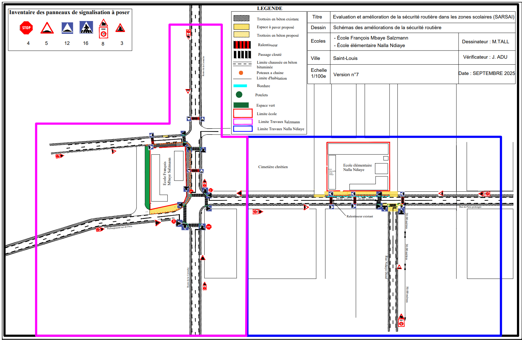 • François Mbaye Salzmann Primary School (570 pupils), pink zone: To address the risks, 3 speed bumps and 5 pedestrian crossings were installed, along with sidewalks on both sides of the school wall. Chain-linked bollards were added along part of the sidewalk next to the school to guide pedestrians toward safer crossing points.